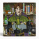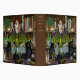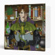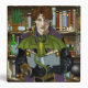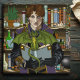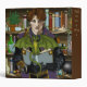 A young male wizard holding an old book that has a cute small green dragon sitting atop the book. In behind them is a library filled with books, potions, cauldron, crystal ball and plants.