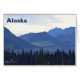 Blue mountains, blue lake water, dark green trees, pink fireweed, and overcast. A depiction of summer in the far north. Text reading "Alaska" also appears. Mosquitos not included.