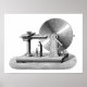Drawing of Faraday disc, the first electromagnetic generator, invented by British scientist Michael Faraday in 1831. The copper disc (D) rotated between the poles of a horseshoe shaped magnet (A), creating a potential difference between the axis and rim due to Faraday's law of induction. If an electrical circuit such as a galvanometer was connected between the binding posts (B) and (B') the motion induced a radial flow of current in the disc, from the axle toward the edge. The current flows into the spring contact (m) sliding along the edge of the disc, out of binding post (B') through the external circuit to binding post (B) , and back into the disc through the axle. Turning it in the opposite direction reverses the direction of current. The caption also says that passing a current from a Bunsen cell (battery) through it would cause the disc to turn, making it function as an electric motor. The labelled parts are given in the caption as:
