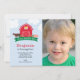 A fun, farm party invitation featuring a sweet red barn illustration complete with barn animals as well as the birthday kiddo’s photograph. Customize with your party details. The back features a simple pattern with the same cow, chicken and pig silhouettes found on the front illustration.