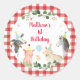 These cute birthday stickers feature watercolor farm animals with greenery, colourful confetti and a red gingham border.