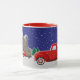 Farm Animal Stack in Little Red Truck with livestock barn and windmill in winter scene with snowfall - featuring the original "Little Red Truck" artwork of Rick Ellinger. Farm animal stack includes cow, pig and chicken.