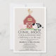 This cute and modern "oink, moo, cock-a-doodle do" gender-neutral baby shower by mail invitation features a pig, chicken, and cow with a red barn on a beige background framed by a white border. The reverse side features a white background with black cow patterns. Personalize for your needs. You can find matching products at my store.