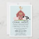 This cute and modern "oink, moo, cock-a-doodle do" boy baby shower invitation features a pig, chicken, and cow with a red barn on a light blue background framed by a white border. The reverse side features a white background with black cow patterns. Personalize for your needs. You can find matching products at my store.