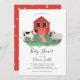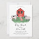 Cute farm theme baby shower invitation template card featuring illustrations of a cow, pig, and a sheep in front of a red barn. This invite works for mothers expecting both boys and girls.