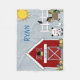 Cute fleece blanket for a baby shower, new baby, Christmas or birthday gift. Big red barn with area to write date or name. Bright Sun shines down on all the happy critters in the barn yard. Add monogram, name or initials if you like.