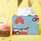 A cute farm animals and red tractor barnyard design pattern with a blue background. The farm animals included in this design are goat, cow, horse, ducks, sheep and pig. The perfect boy barnyard design for farm enthusiasts.