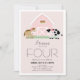 This cute and modern girl's birthday party invitation features a horse and cow with a pink barn on a blush pink background framed by a white border. The reverse side features a white background with black cow patterns. Personalize for your needs. You can find matching products at my store.