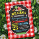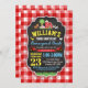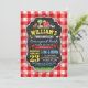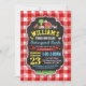 Farm birthday invitation with red plaid, red tractors, a barn and cute farm animals, a horse, pig, cow, chicken and duck. This invitation is perfect for a boys or girls farm theme birthday party.