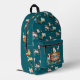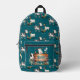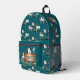 Kids backpack with cows, goats and chickens design. Personalize this pretty teal blue pack with child's name. Farm themed pattern is perfect for boys or girls and features a fun collection of barnyard friends. More animals line up across the zipper and side sections. The name template is over a rustic wooden sign on the zippered pocket.