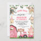 Cute girls farm themed birthday invitation featuring a pink barn and tractor, various barnyard animals and a sign.