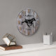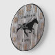 Personalize this custom barnwood styled clock with your farm, ranch, or stable name to add a personal touch to the decor. Barnwood look clock face with galloping horse silhouette in centre. Choose one of two sizes and two colours of clock hand, whichever is to your liking.