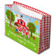 This cute and fun gift bag can be personalized with a name or title such as son, grandson, nephew, friend etc. It features a brown hair boy with fair skin beside a red barn with a rooster wind vane. There are adorable farm animals such as a cow, pig and hen. In the background is a bright blue sky, apple trees, sunshine, butterflies and daisies.