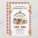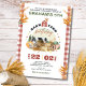 This invitation showcases a delightful image of stacked hay, adorable farm animals, and is accompanied by other farm-related illustrations, creating a vibrant barnyard atmosphere. Colourful and complete with a border adorned with charming farm crops, it's the perfect invitation to set the tone for a fun farm themed party.