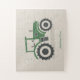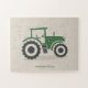 A light beige puzzle with an illustration of a green and grey farm tractor in cartoon style and customizable text below! It could be a perfect gift for a kid!