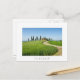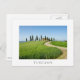 Postcard of a curvy road through the grain crops toward a farm villa with a row of cypress trees in front of it near Pienza in Val d'Orcia valley in Tuscany, Italy with a white border and the text 'Tuscany'.