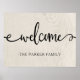 This rustic and trendy farmhouse look poster features a faux white wood look background, with the word "welcome" in a swirly font. Personalize with your family name.