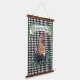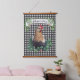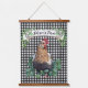This farmhouse style Hanging Tapestry features an all over black and white gingham check pattern with a chicken in a patch of clover. A banner above the truck can be personalized with your name.