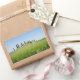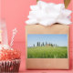 Rectangular photo sticker with a farmhouse with cypress trees and waving wheat grains in spring in the Val d’Orcia valley in Tuscany, Italy.