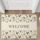 A off-white, light beige background decorated with a retro farmhouse style rooster and hen pattern. Sample text: welcome