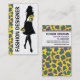 Fashion designer girl with yellow purple green panther print eye-catching business cards, featuring a modern fashionable model girl in black with panther/leopard animal print strapless top and handbag in yellow, purple, green on white background and a pattern band. A stylish, elegant, trendy profile card for a fashion designer, consultant, boutique owner, a fashionista or for fashion show and any fashion industry field. Some elements courtesy of vectorportal.com.