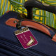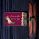 Chic lady's luggage tag done in maroon, with graphics of a brown and black jaguar fur pattern, with an ivory ribbon, and a pair of jaguar print stiletto high heels, on the front. Personalize the ivory text to suit your needs. A stand out luggage tag that is hard to miss.