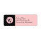 Stylish return address labels done in pale pink, with black custom text. A black with small pink polka dot pattern decorates the left side of the label, with a pink round disc and a black one letter monogram. Personalize all the text on this fashionable address label, great for personal or business use.