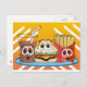 Whimsical cartoon fast food restaurant menu of a soda, cheese hamburger, and french fries.