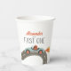 Fast One Race Car 1st Birthday paper cups with blue retro race car.