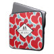 A laptop sleeve with a repeating pattern of 2 different sized fat red hearts each heart surrounded by a white outer border. A diamond shaped frame layered over top with your text inside.