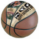 Happy Father's Day Dad Personalized Basketball. The design is lettered with "Happy Father's Day Dad" and the template is ready for you to personalize with your custom text such as, Best Dad Ever, love [kids name and year]. The typography is decorated with basketball player silhouettes and a woodgrain effect background. Great father's day gift for a basketball dad!