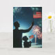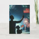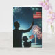 A young boy and a man stand in silhouette against a backdrop of vibrant fireworks, each holding American flags for Father's Day.