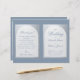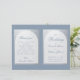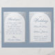 Un élégant programme de mariage plié avec fausse feuille d'argent et bleu poussiéreux, une couleur très moderne. Sur l'avant, il y a des arcs blancs sur faux argentés contenant le texte, sur l'arrière, le texte est en rectangles blancs avec des bordures d'argent. L'arrière - plan est bleu poussiéreux, tout comme le texte. Les titres et les noms de la mariée et du marié sont écrits dans un élégant script calligraphique, le reste en casquette. Pour le Mariage à l'arrière, l'équipe de mariée et l'équipe de mariés sont sur des colonnes séparées.