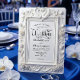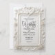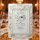 Set the tone for a timeless fairytale union with this ornate, vintage-inspired design. Perfect for couples seeking traditional luxury and classic romance.This design features a sophisticated digital rendering of a 3D ornate baroque frame, creating a sculpted look with symmetrical scrollwork and leaf flourishes. At the center, two paired swans form a delicate heart crest surrounded by decorative roses, all rendered in soft ivory and creamy off-white tones with subtle light gray shading to mimic depth. The text is presented in an elegant calligraphy script header paired with traditional charcoal serif typography for a formal finish.This is a flat printed image with a printed faux relief effect, not actual raised material or embossing.