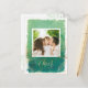 A holiday photo postcard features faux foil gold leaves and winter berries.