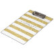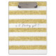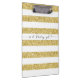 First, I really liked the weight of the clipboard. It's heavy but not too heavy. I like the feel of it as well. Really smooth but like it has a coat of matte polyurethane on it on both side. The clip is sturdy and strong. The design is the best. I'm really into gold right now and this stripped, gold glitter thing is right up my alley! The printing is great! I put my logo on the back really large and small in the front. I'm always misplacing my clipboards at weddings and events and this one should never get lost. Love the colors. Came out so well!