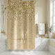 Easily personalize this trendy chic shower curtain design featuring pretty gold sparkling faux glitter on a gold brushed metallic background.