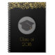 A spiral notebook which says: Class of 20xx. Designed with fake gold confetti glitter. Set on a black background. Illustrated with a black graduation cap with a semi-transparent circle behind. Elegant and chic.