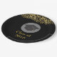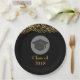 A paper plate which says: Class of 20xx. Designed with fake gold confetti glitter. Set on a black background. Illustrated with a black graduation cap with a semi-transparent circle behind. Elegant and chic.
