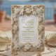 Set a tone of timeless luxury for your ceremony with this ornate design, featuring a printed gold relief effect and classic cherub details on soft cream.This design features a rich, symmetrical visual composition mimicking a high-relief gilded frame. The artwork displays two cherubic angels resting atop intricate scrollwork corners, connected by clusters of blooming roses in warm metallic tones. A central oval crest highlights the couple's monogram, set against a smooth ivory-colored background. The typography combines a romantic flowing script for names with a traditional serif font for details to ensure maximum legibility.This is a flat printed image with a faux embossed foil effect, not actual raised material or metallic leaf.