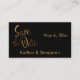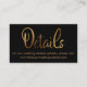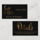 Keep your wedding guests in the loop with all your details with these pretty wedding favour insert cards. Elegant text overlays were designed using a modern, casual script font embellished with a smooth faux gold foil effect. In this font, one side reads "Save the Date" and the other, simply says "Details". Use the template fields to customize with your personal information. The background is covered in black and this editable colour can be changed to anything from your wedding palette that you choose; all editable text appears in a complementary golden hue. // 102 //