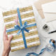 Customize this stylish Faux Gold Glitter Happy Birthday Custom Wrapping Paper, designed with gold and white horizontal stripes and with custom text and name written on them. Please note that the gold glitter is a colour print and is not an actual glitter or metallic gold foil.