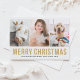 Merry Christmas | Spread holiday cheer with a little sparkle with this stylish multi-photo Christmas postcard. This modern Christmas postcard features faux gold glitter and modern typography with a three-photo collage. Personalize by adding your details. This custom photo collage Christmas postcard is available on other cardstock.