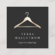Elegant business cards for seamstresses, fashion designers, tailors, alterations or dry cleaners in a unique square format feature a clothes hanger in faux gold foil, on a rich charcoal grey off-black background with two lines of custom text in white. Customize the back with your full contact details.