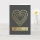 This greeting card features four nested hearts centered on a deep charcoal background, with a distressed gold-foil look that catches the light like tiny flecks of metal ❤️. The layered heart shapes feel like they’re gently glowing outward, giving the design a cozy, romantic pull without needing any characters at all 🥰. The dark backdrop stays smooth and even, making the gold tones look richer and more intimate, like candlelight against a night sky. Beneath the hearts, a horizontal gold banner stretches across the card and visually “holds” the message in place. The text reads “HAPPY Valentine’s DAY,” with “HAPPY” and “DAY” in a classic serif style while “Valentine’s” is in a flowing cursive-like letterform, all set in gold. The words sit centered on the banner, framed by pointed ends that angle outward to the left and right. Fine speckling and worn edges in the gold texture appear on both the hearts and the banner, adding depth against the charcoal field.
