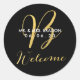 Gold "Welcome" Calligraphy Script on Black Background Personalized with Gold B Monogram Initial - Wedding Welcome Sticker. The monogram initials are available at www.zazzle.com/monogramgallery