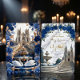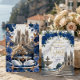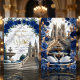 Set the tone for a majestic celebration. This design features a romantic cathedral scene with royal blue blooms and faux gold accents, perfect for fairytale unions.