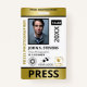 Vertical press ID with faux gold and black as accent colours. Add photo, logo, name, title, ID number and more against a white background.
