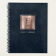 This elegant planner features a digital background image in imitation of navy blue leather texture. Personalize it with your monogram initial in navy blue decorative font and your name in navy blue copperplate lettering on a rose gold faux brushed metal square, along with the year or other text of your choice in rose on the navy blue background.