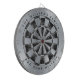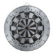 A classic dartboard design with alternating black marble and faux silver triangles. The outside circle is faux silver foil. There is a family name above and a message below, both in black arched text.